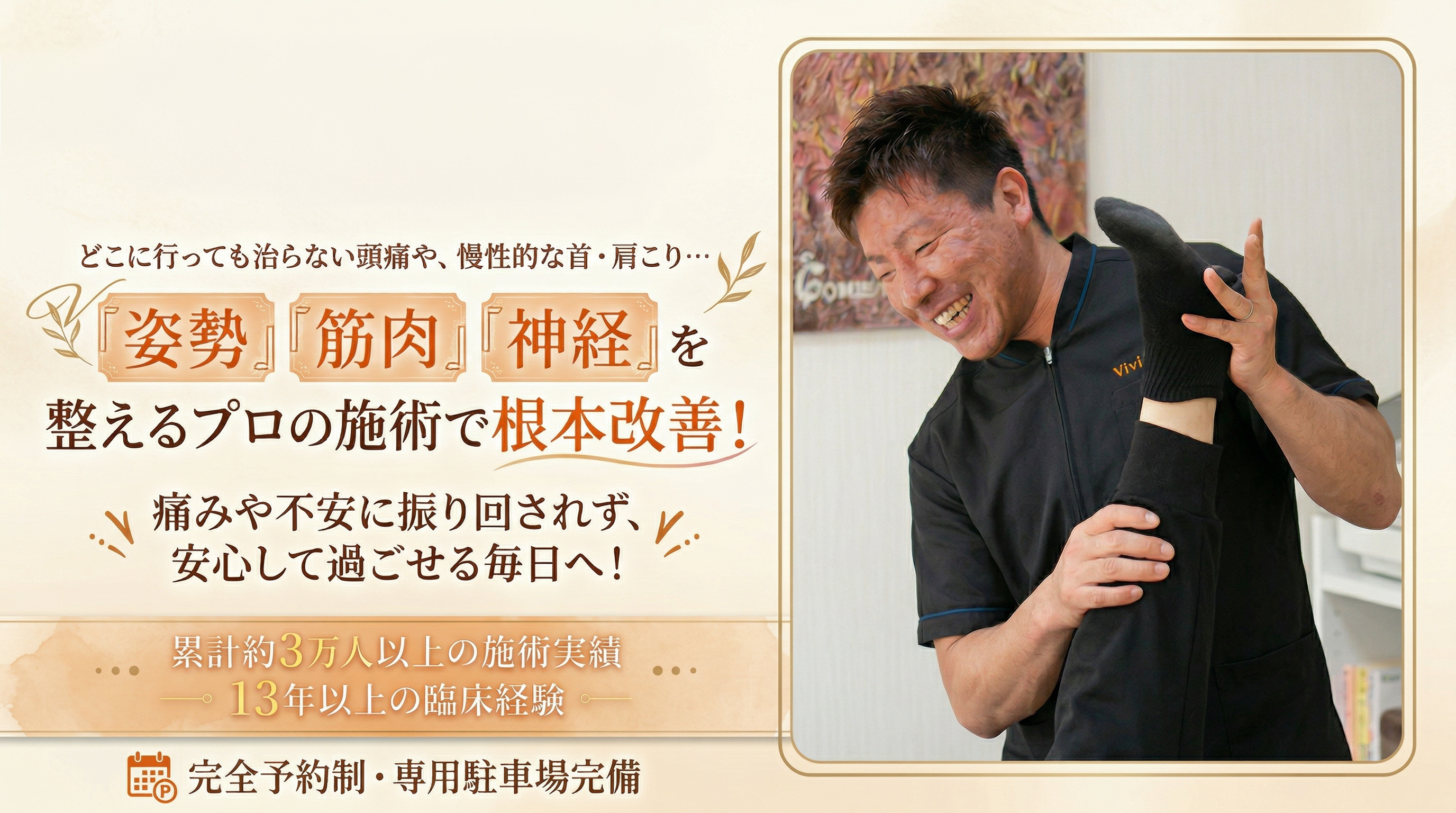 その中でも首や肩のお悩みはもちろん、頭痛・姿勢の改善サポートを数多く行ってきた実績と13年以上の臨床経験があります。